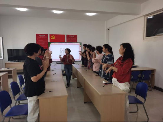 隨著老師隨機喊出氣象詞匯,居民們迅速做出對應(yīng)動作,從輕柔的“小雨”手勢到奔放的“暴雨”拍桌子,在動作切換中逐漸放松身體。老師引導(dǎo)大家:“把心里的壓力跟著‘大雨’‘暴雨’的動作甩出去,讓‘晴天’的動作帶來輕松感?!爆F(xiàn)場笑聲與動作聲交織,居民們在簡單有趣的互動中釋放情緒,緩解日常壓力。