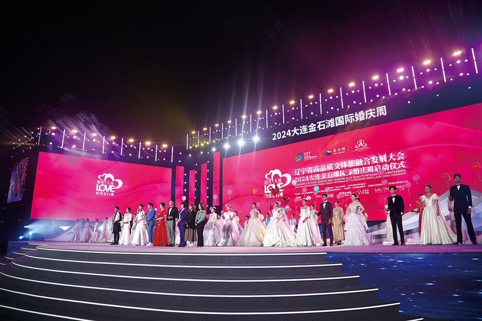 在輕柔海浪與璀璨燈光的映襯下,一曲民樂合奏《象王行》拉開2024大連金石灘國際婚慶周開幕式文藝演出的序幕。演出分為《花好月圓》《山海有情》《遇見大連》《愛在金石》4個部分,以婚慶周原創(chuàng)主題曲《愛在這里停留》、芭蕾+舞蹈演繹《梁?!贰L(fēng)喜服展演、國際婚紗大秀、千萬級網(wǎng)紅達(dá)人現(xiàn)場分享愛情感悟等精彩節(jié)目,詮釋了“遇見大連、相愛金石灘”的主題。